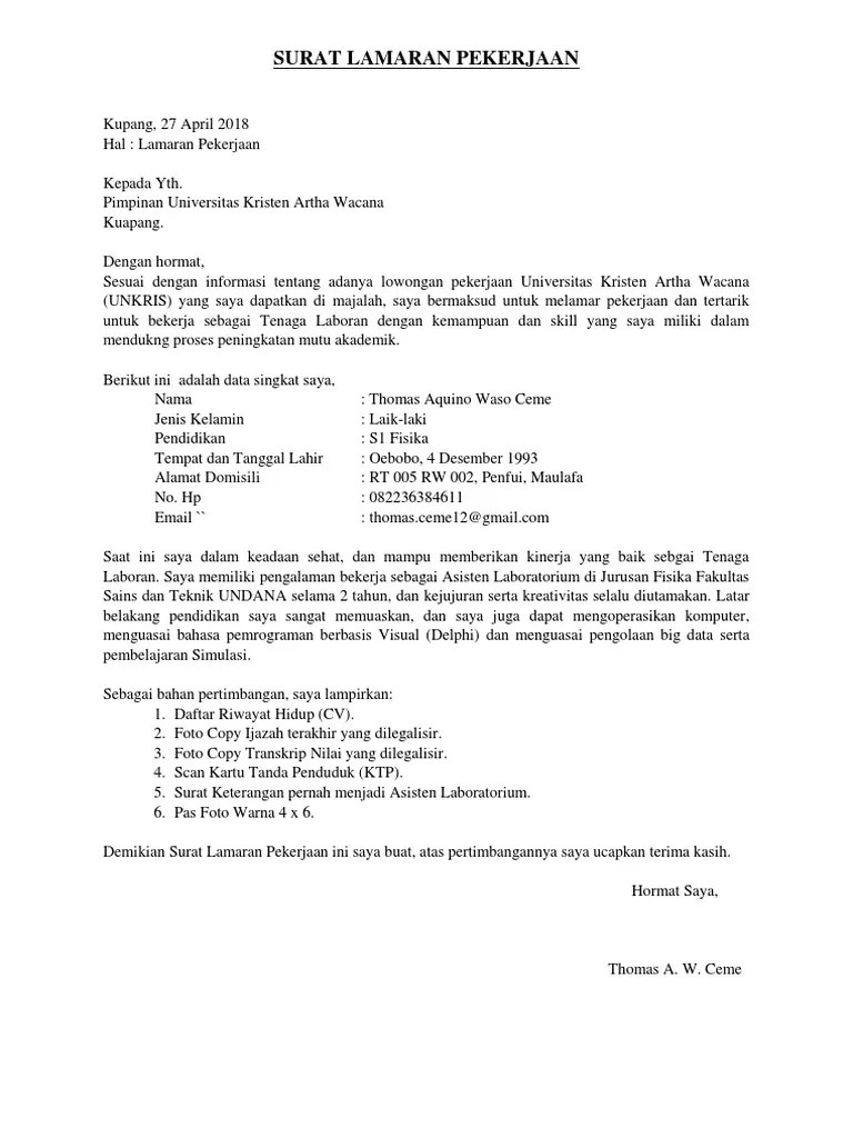 Open recruitment asisten laboratorium komputer infokom 2016 2017 berita lembaga. Bermaksud mengajukan lamaran menjadi dosen tetap pada fakultas pendidikan bahasa inggris sebagai dosen pengajar. Selain tuntutan berbagai macam kemampuan, menulis surat lamaran bahasa inggris juga menjadi syarat penerimaan kerja. Contoh surat lamaran menjadi assistant lab. Contoh surat lamaran kerja bahasa inggris cv wawancara. Selama berkuliah saya juga aktif menjadi asisten lab komputer serta mengikuti kursus dalam bidang. Contoh surat lamaran kerja jadi dosen dalam bahasa inggris in . Lamaran asisten laboratorium · kepada : Kepala laboratorium fakultas ilmu komputer · di · universitas . Contoh 1 (surat lamaran fresh graduate untuk posisi akuntan). Jika bahasa inggris kita bagus, boleh saja membuat surat lamaran. The collection that comprising chosen picture and the best among others. Saya mau share sesuatu nih.